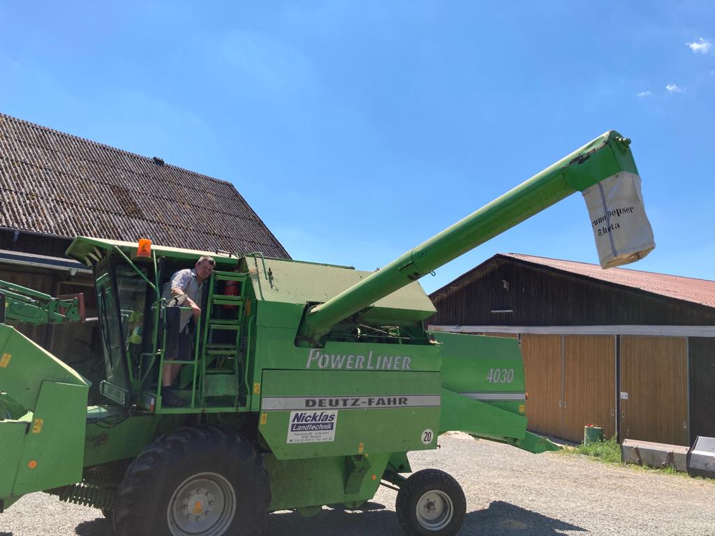Das geerntete Getreide wird direkt bei uns am Hof sowie in einem benachbarten Partnerbetrieb als Futtergetreide veredelt. So stellen wir sicher, dass nur das Beste im Trog landet. Auch das Stroh ist für uns kein Abfallprodukt, sondern ein kostbares Gut: Es dient im Winter in unserem Tieflaufstall als kuschelige Einstreu und kehrt später als wertvoller Mist wieder zurück auf die Felder – ein perfekter Kreislauf, der den Boden lebendig hält.